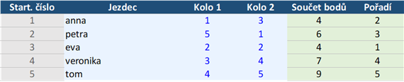2) Vyhrává jezdec s nejnižším součtem bodů: 1. místo 1 bod, druhé místo 2 body atd.