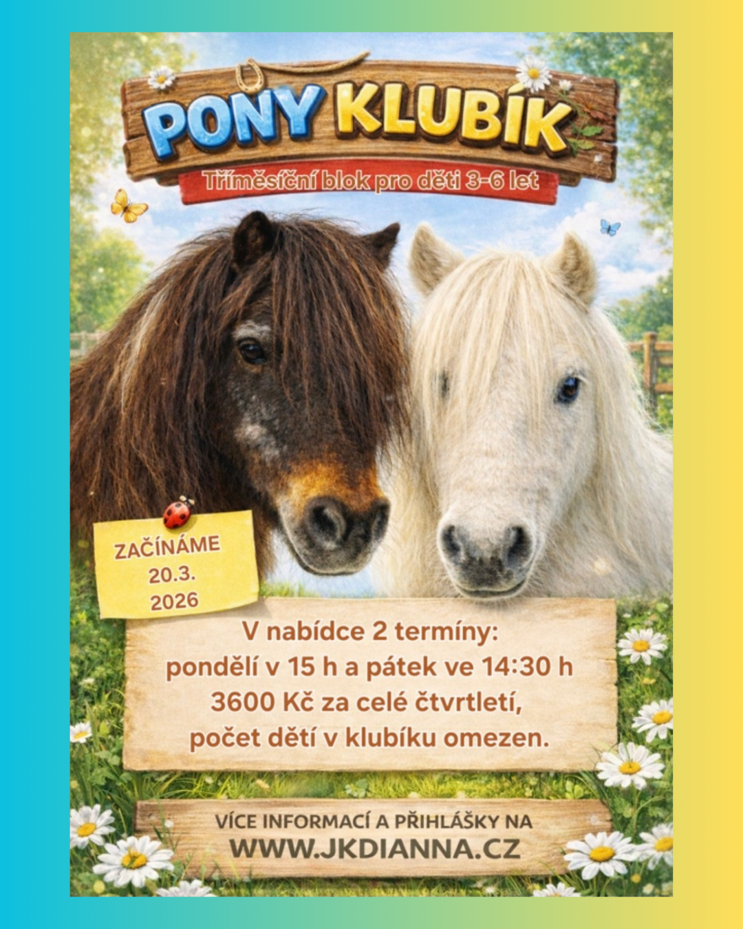 PONY KLUBÍK je určen pro děti ve věku 3–6 let. Program je přizpůsoben věkovým možnostem dětí a probíhá hravou a bezpečnou formou.